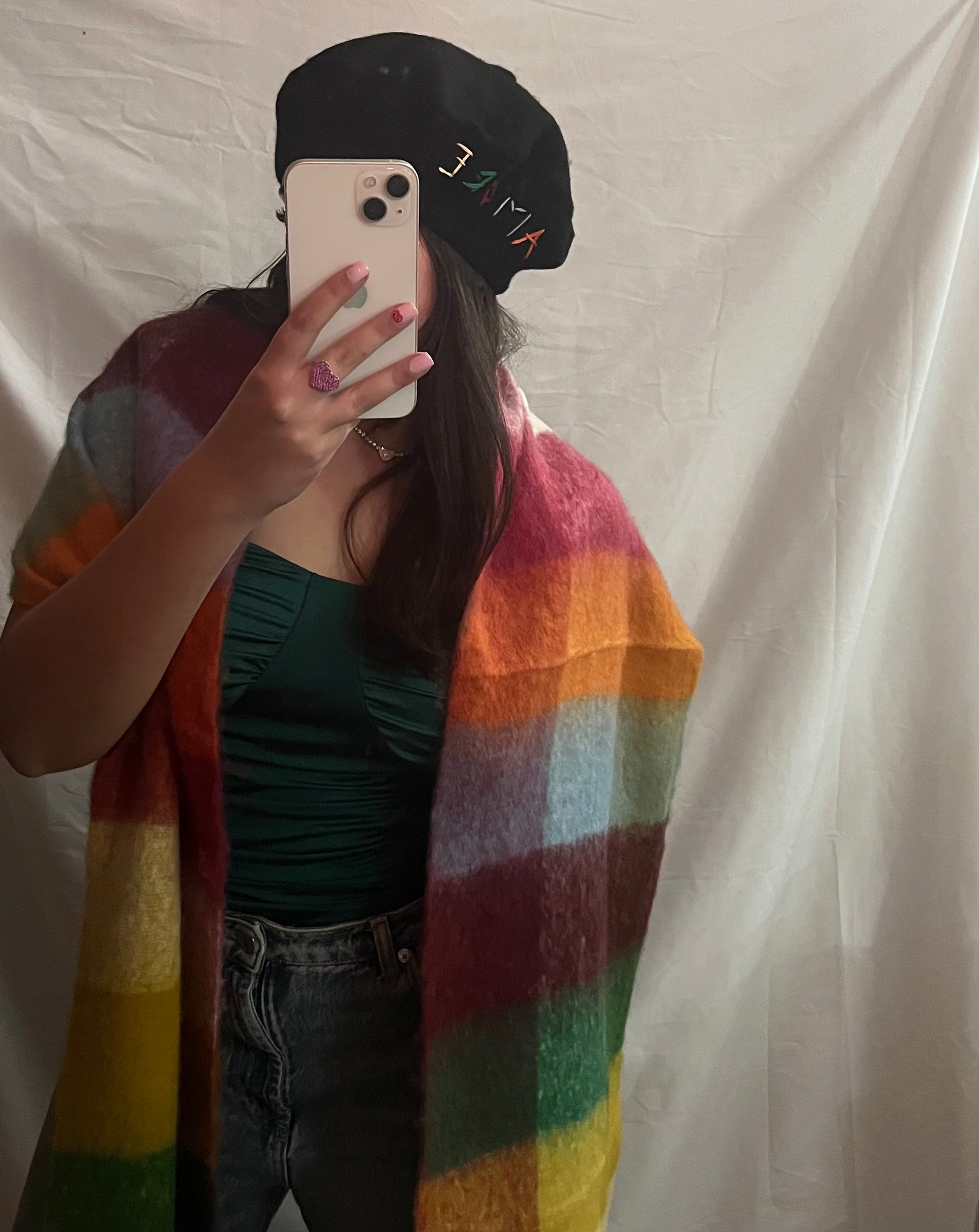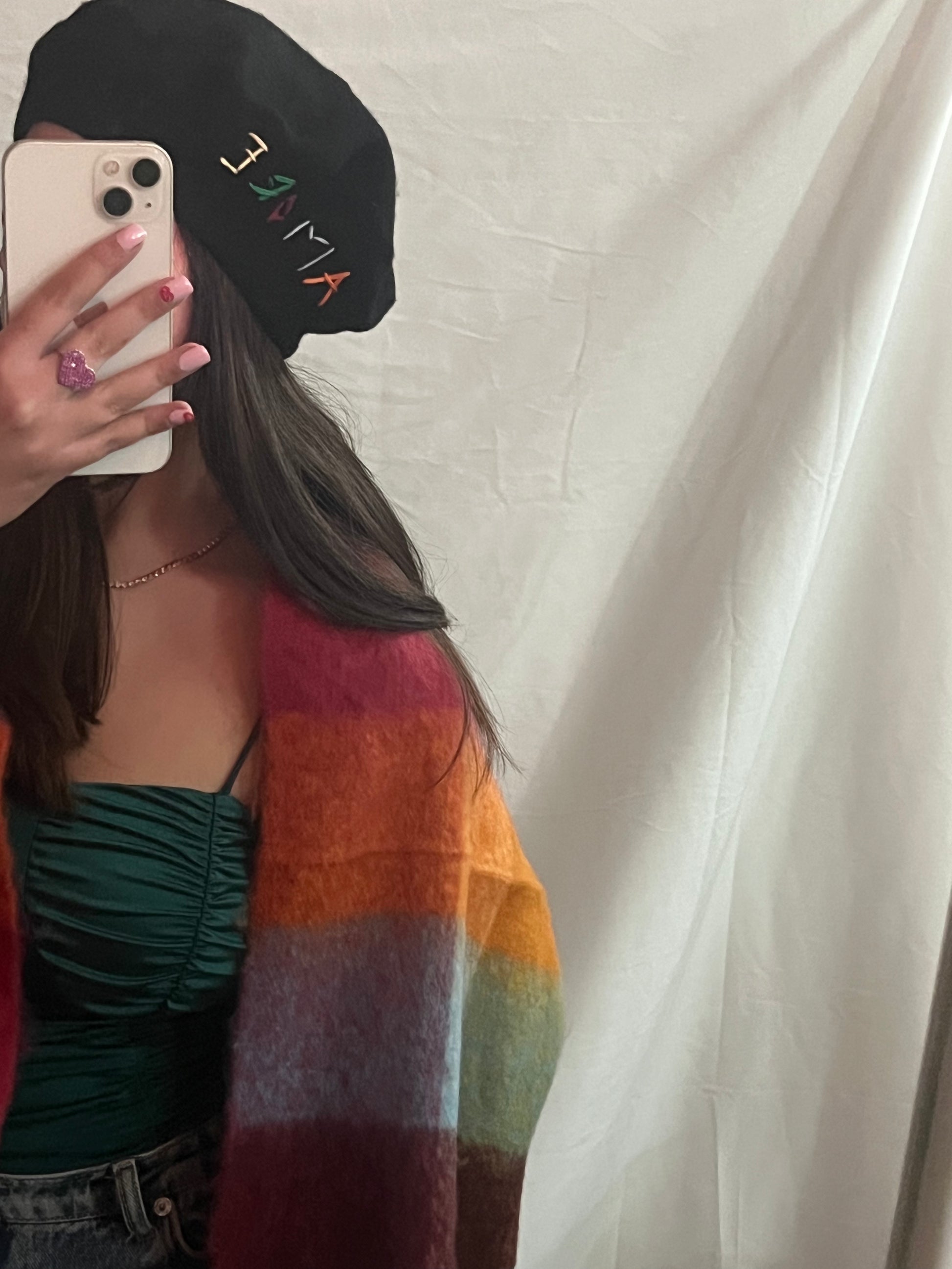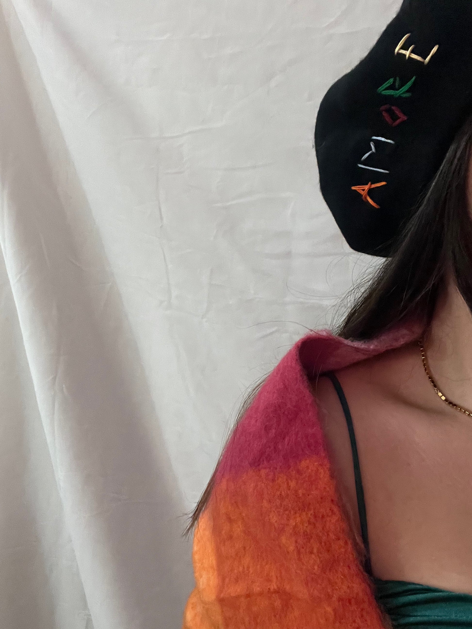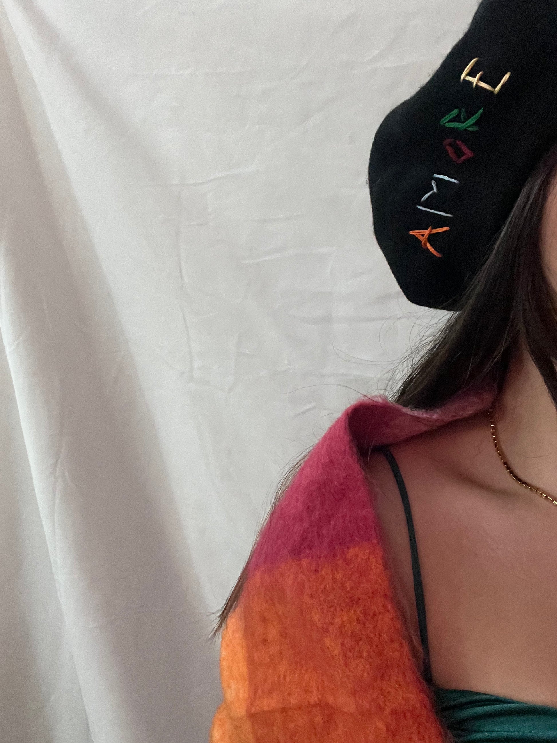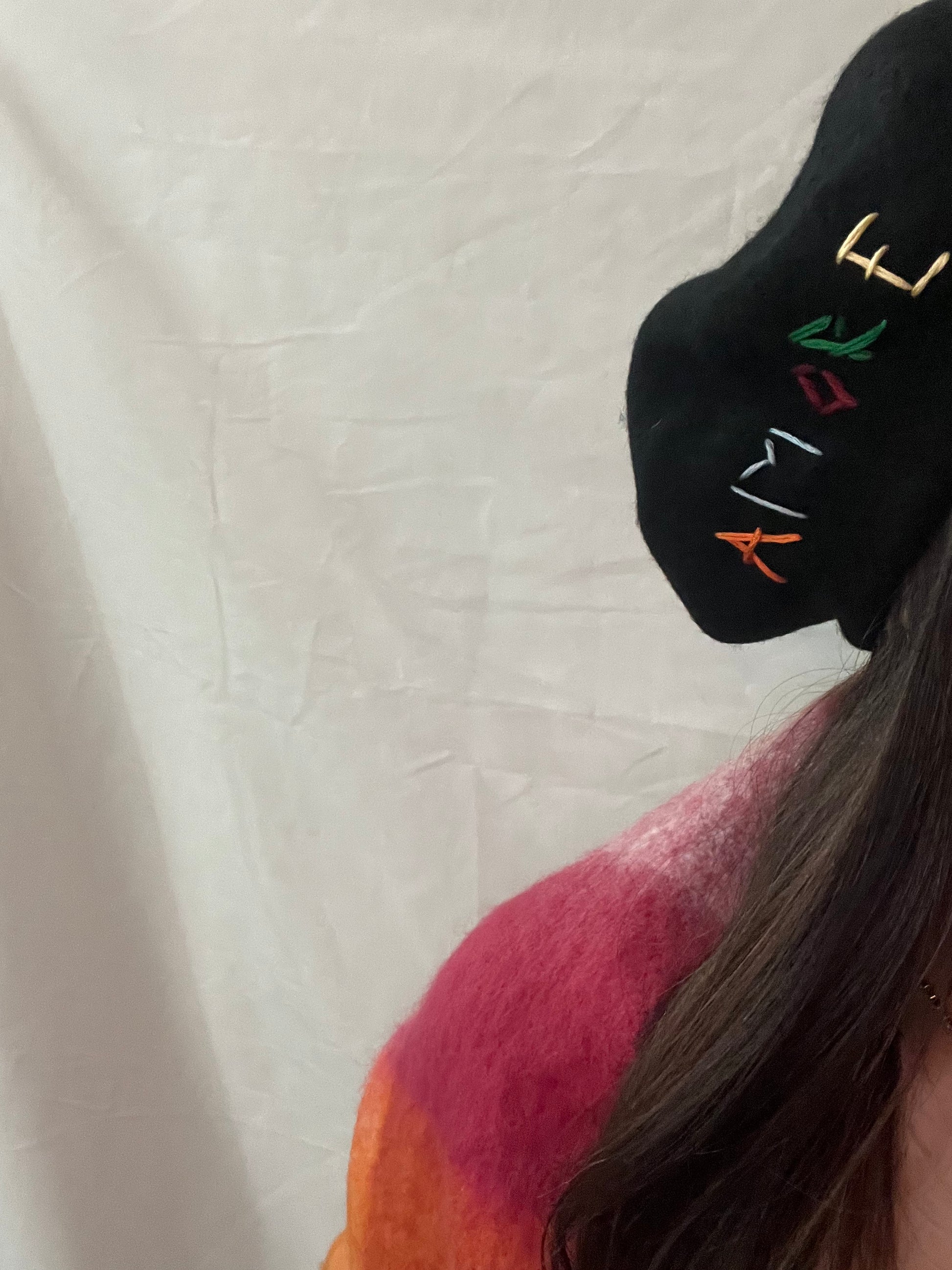 Basco cappello nero con scritta a mano multicolore amore. Handmade ricamo fatto in seta.