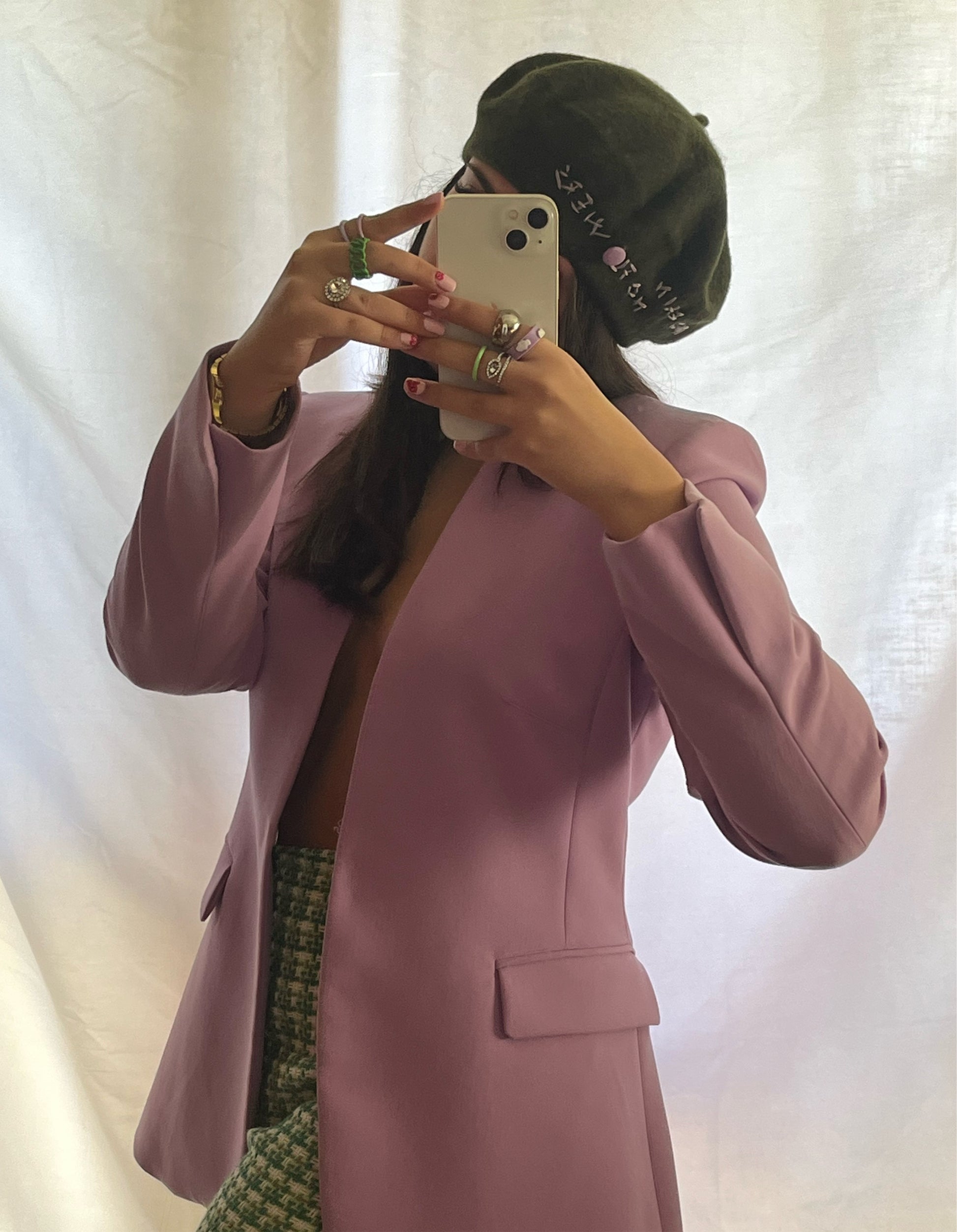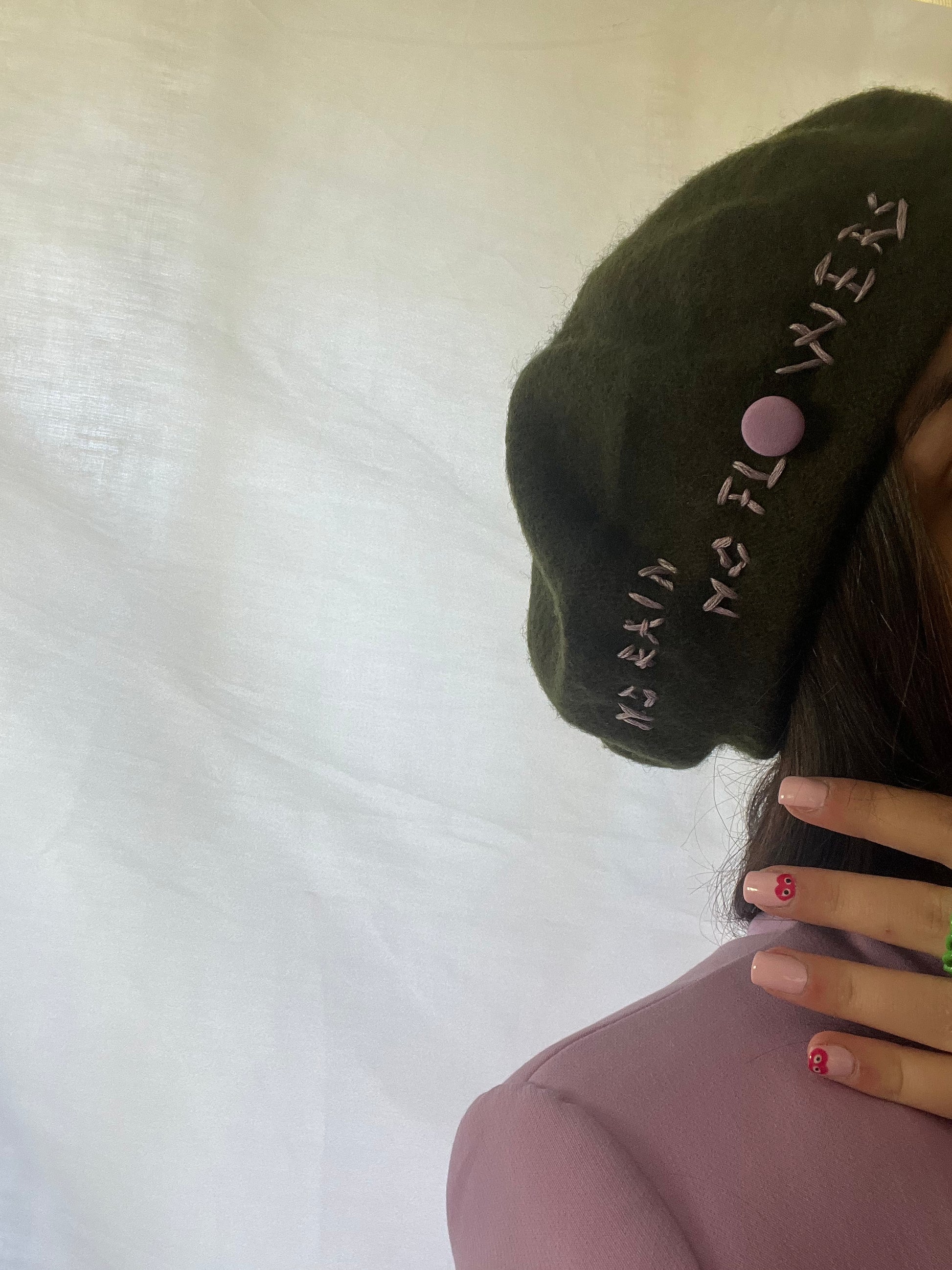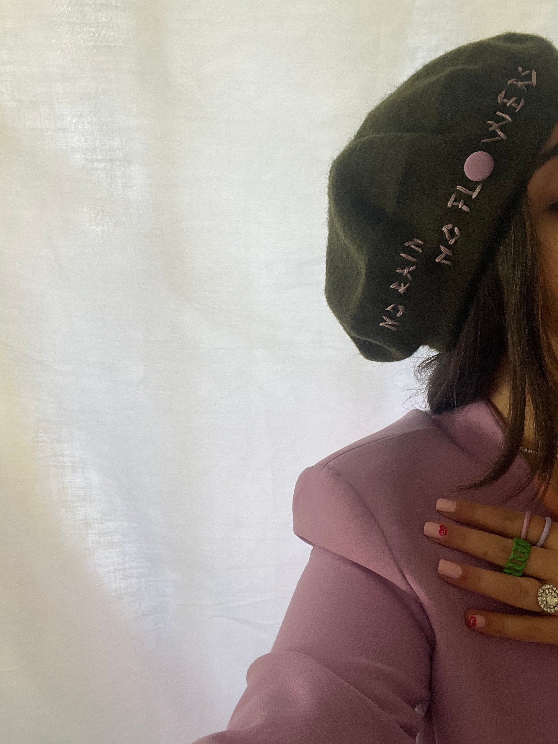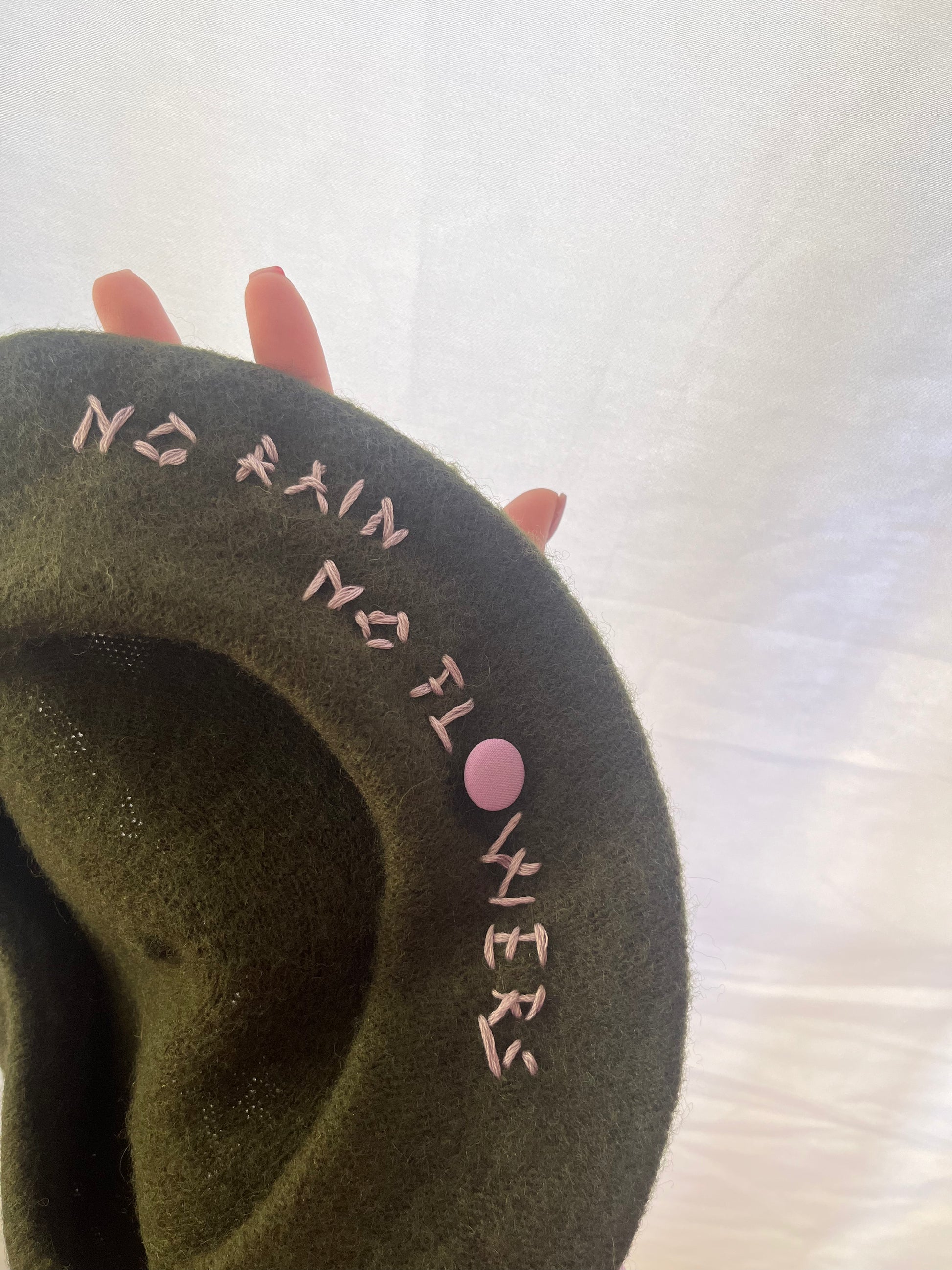 Basco cappello verde militare con scritta a mano no rain no flowers (niente pioggia, niente fiori). Handmade ricamo fatto in seta e bottone recuperato da tessuto vintage.