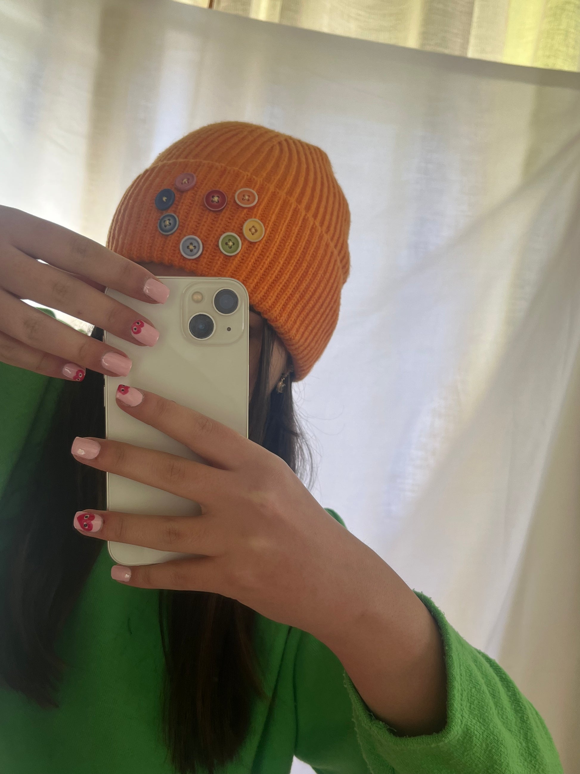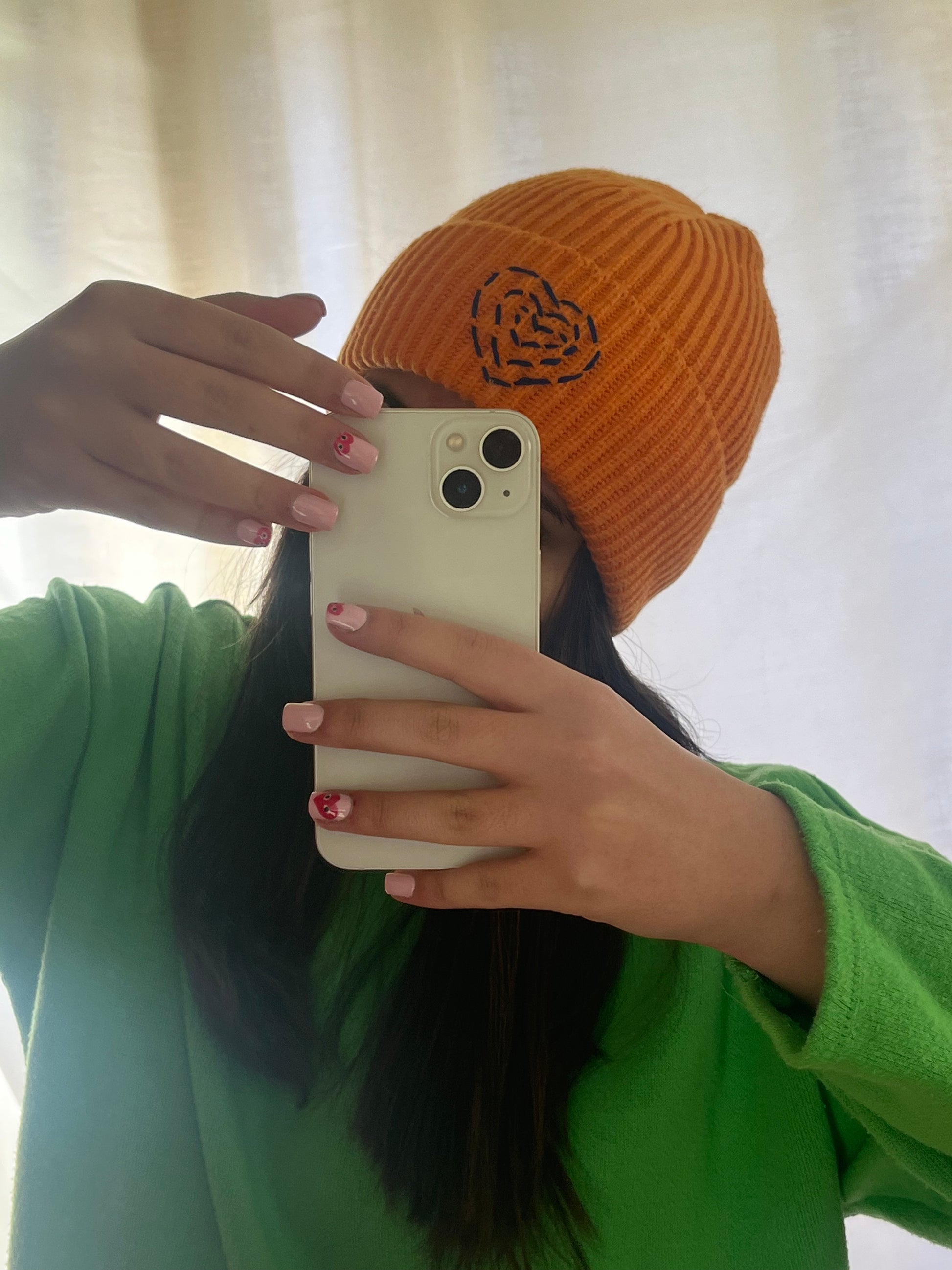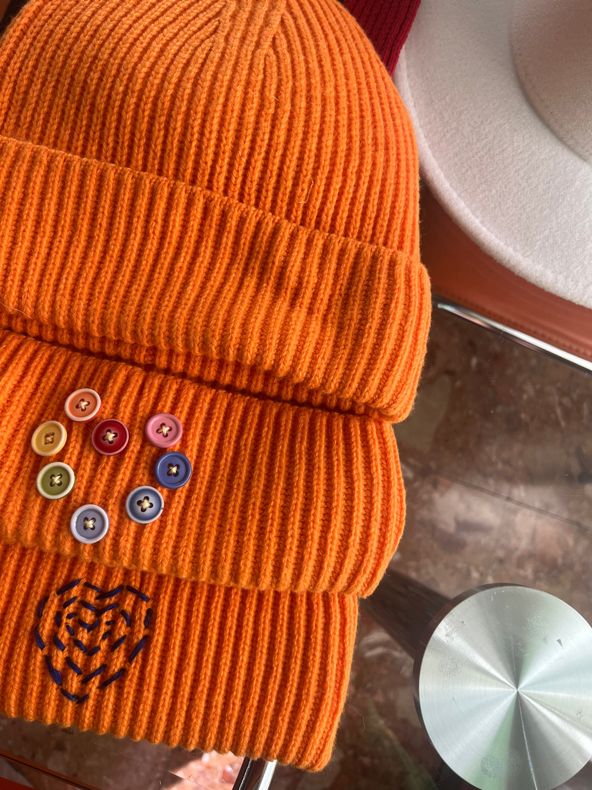 Berretto invernale arancione handmade con dettaglio particolare realizzato a mano da noi.