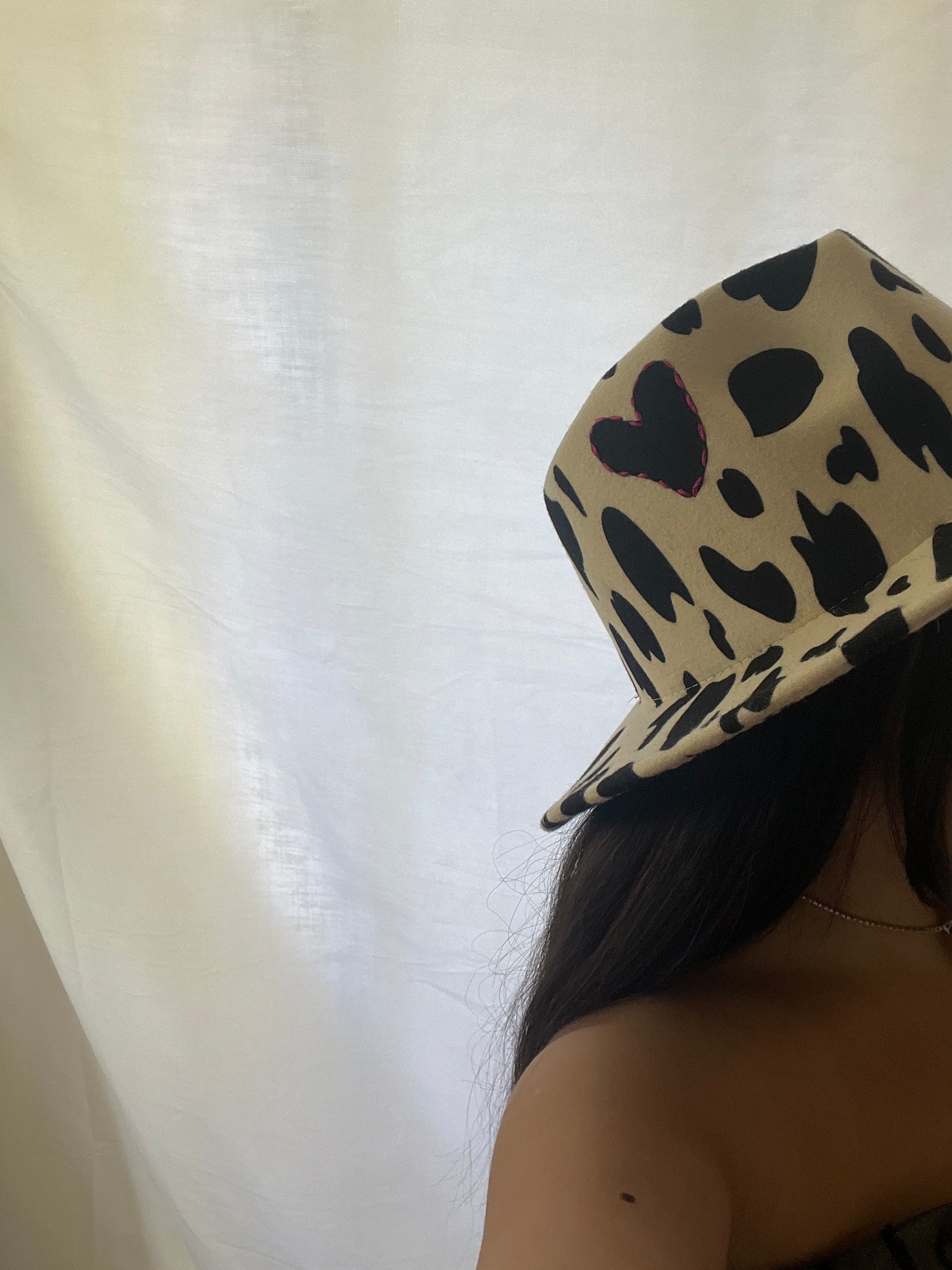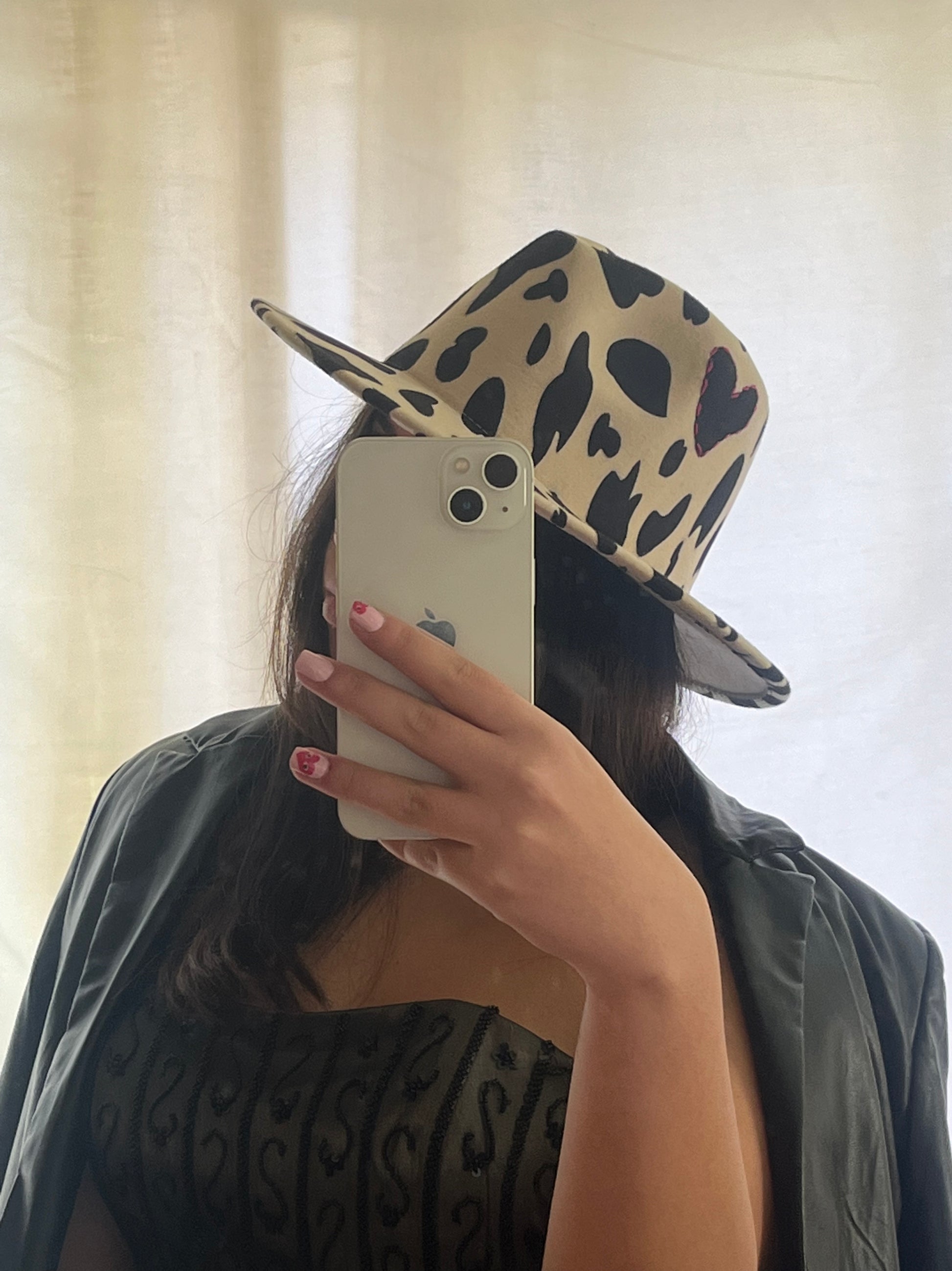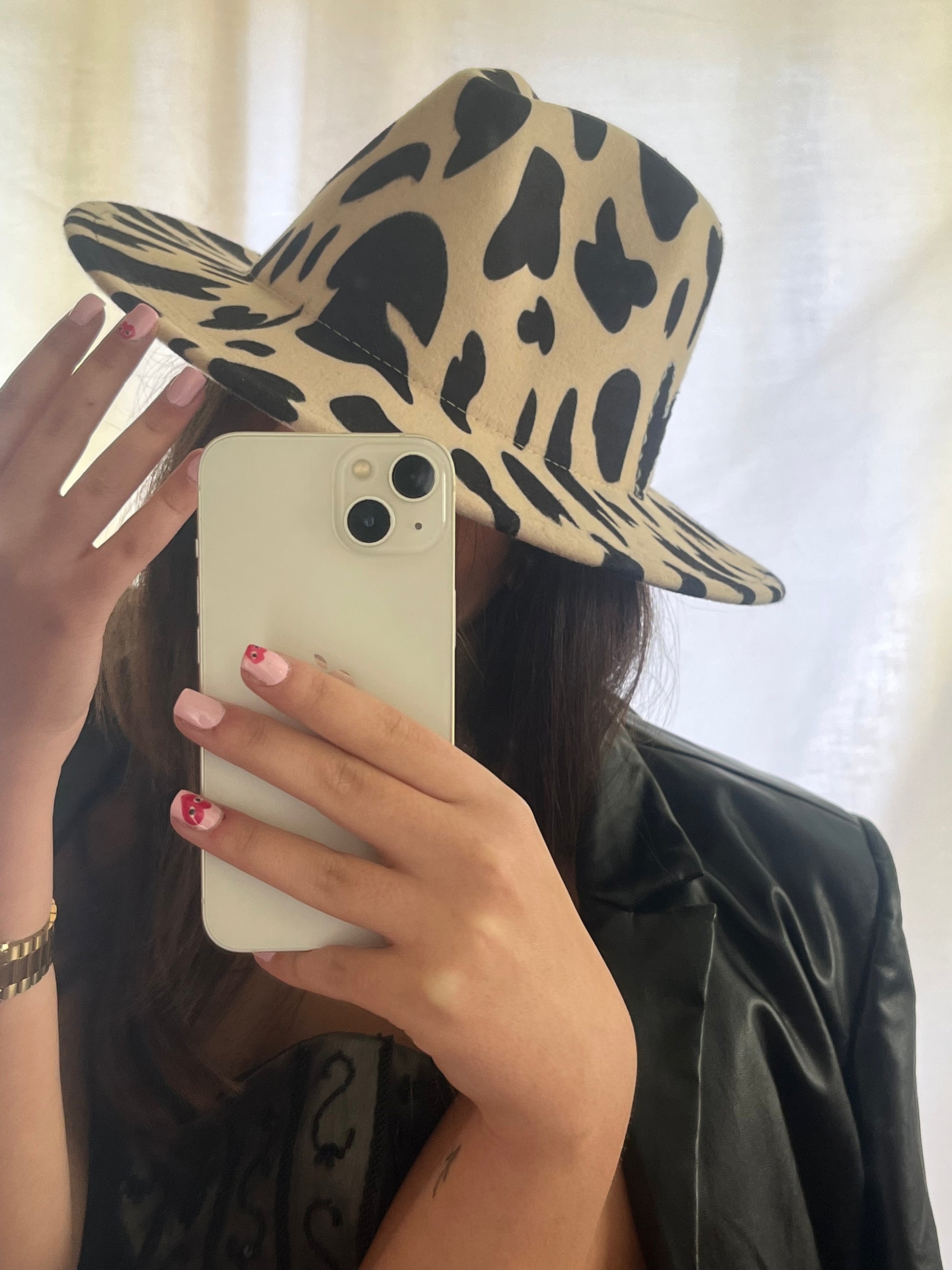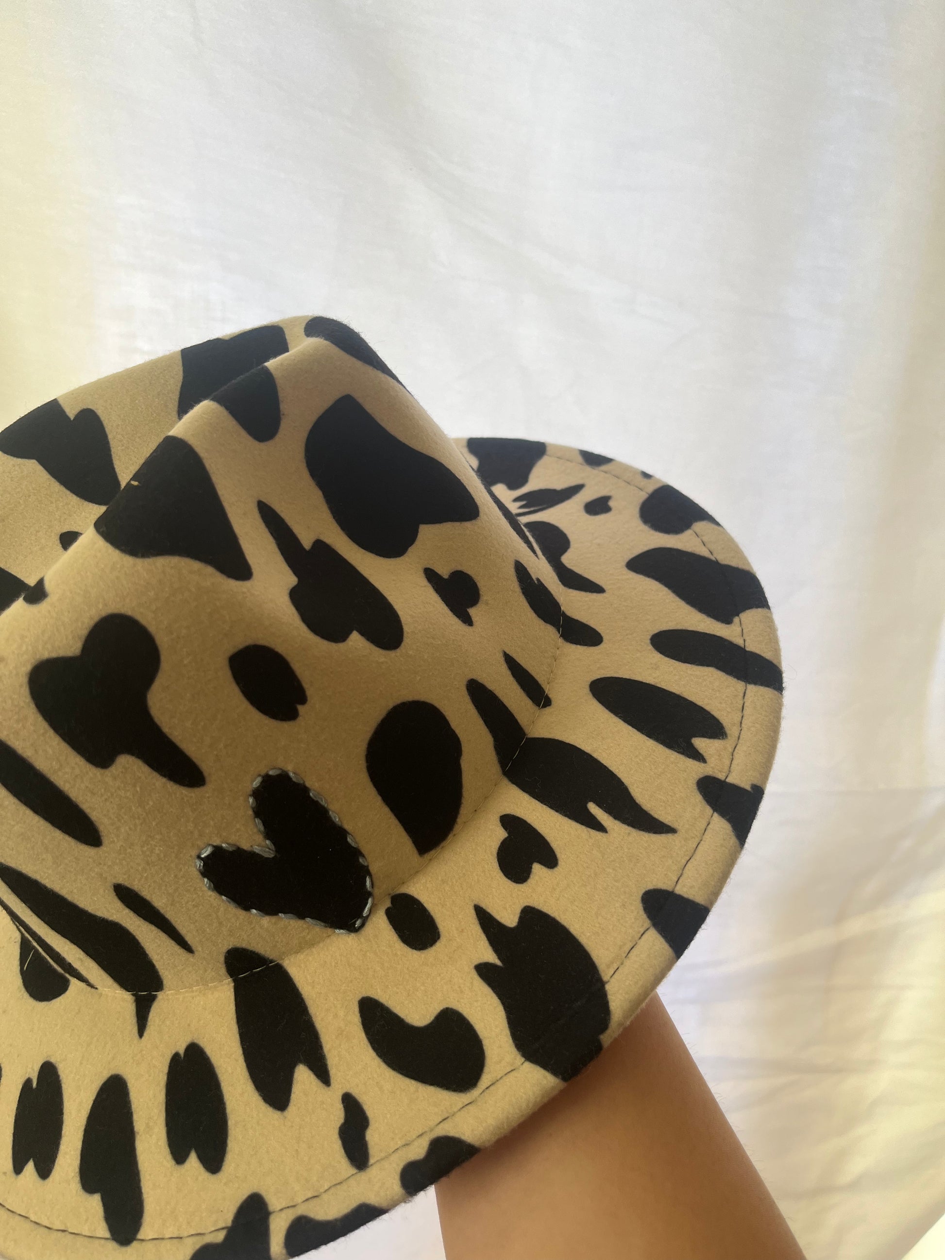 Cappello fedora cow, motivo mucca a macchie. Circonferenza 58 cm. Dettaglio realizzato a mano disponibile in due varianti: