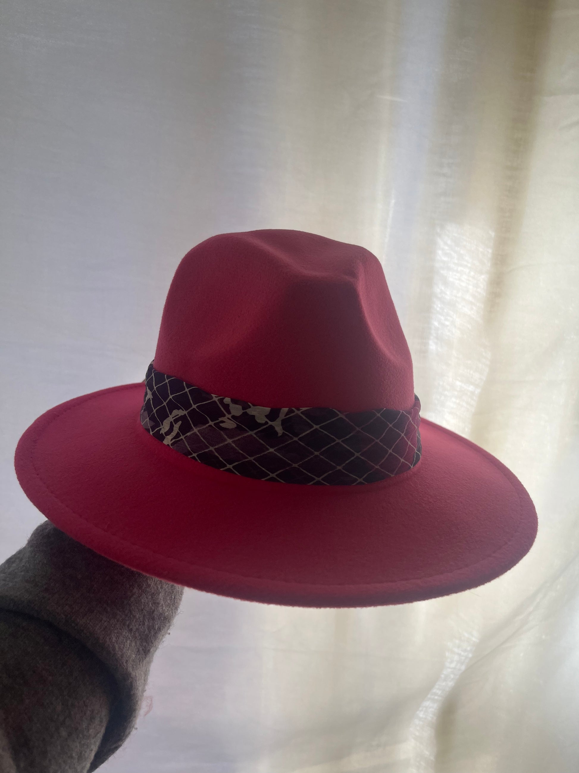 Cappello fedora fucsia con fascia rimovibile recuperata da cravatte vintage sui toni del viola.