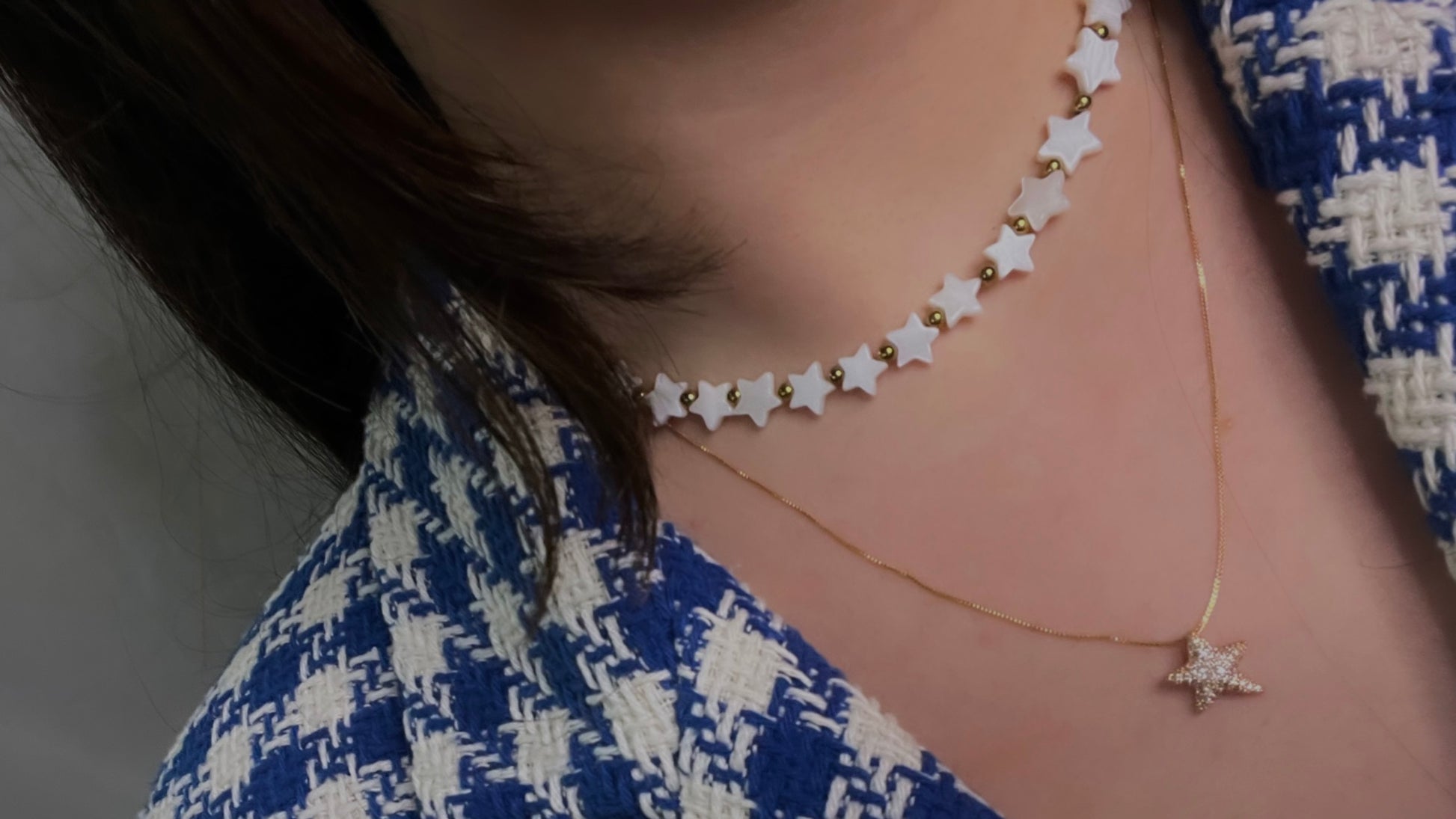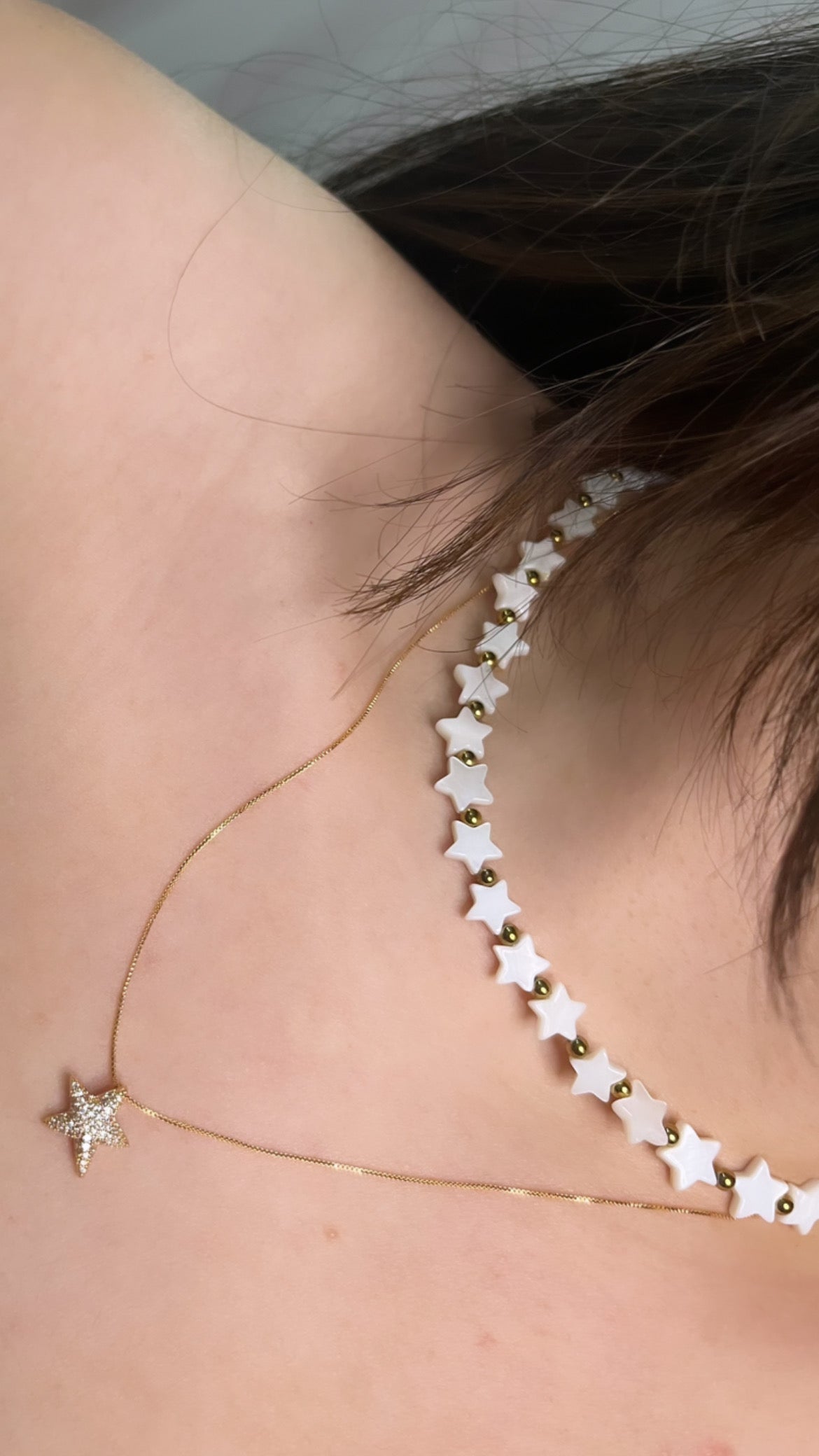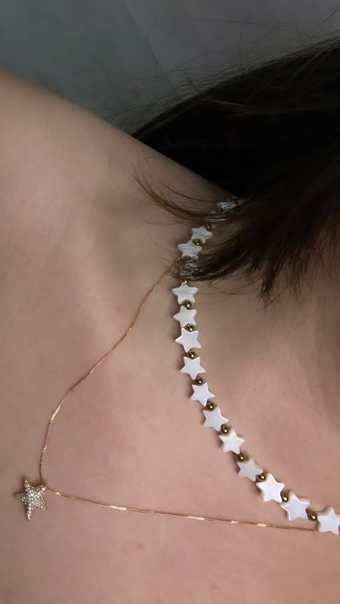 Collana “stelline” con stelle bianche in perla. Regolabile sul retro. Base dorata inossidabile.