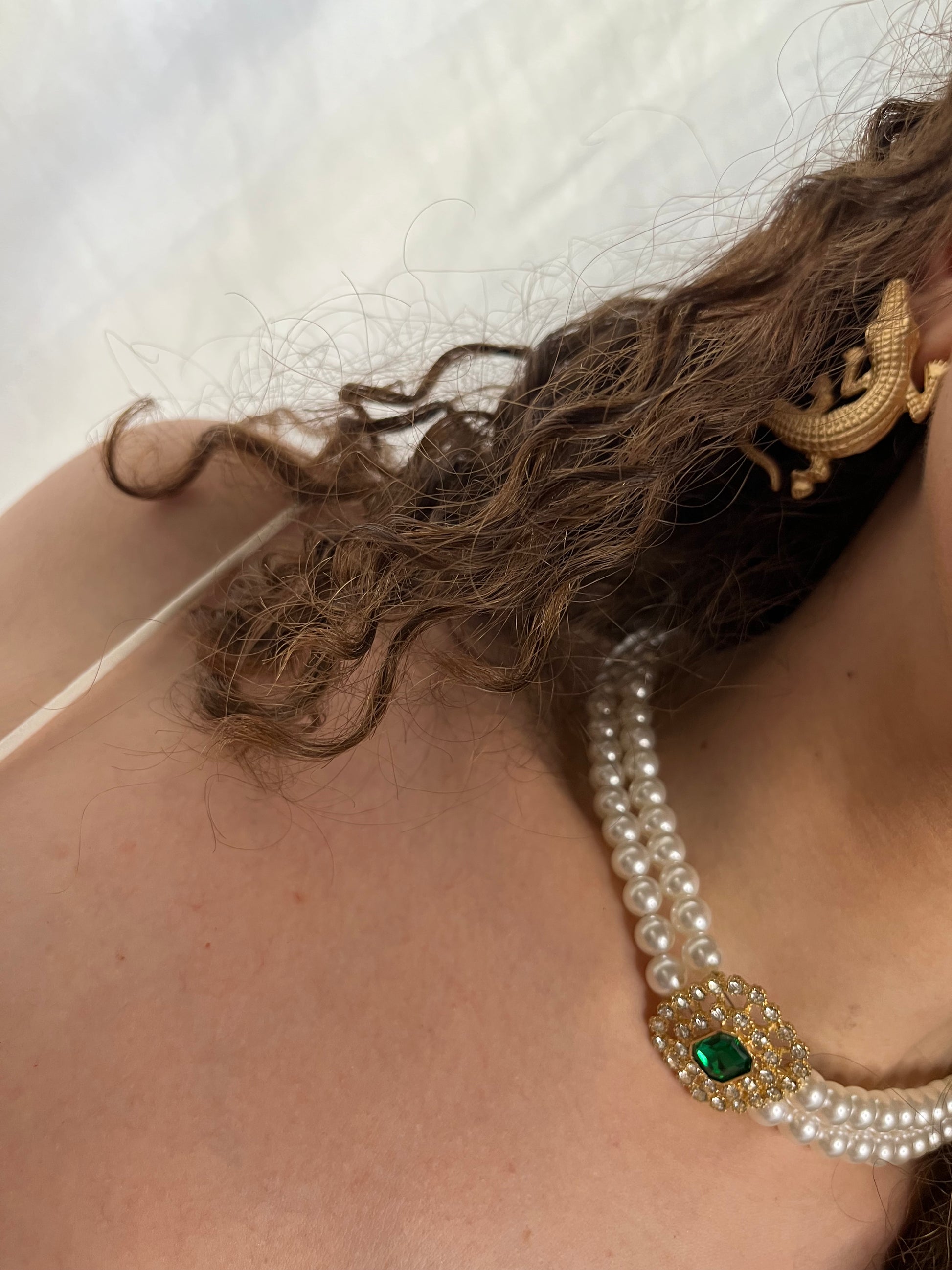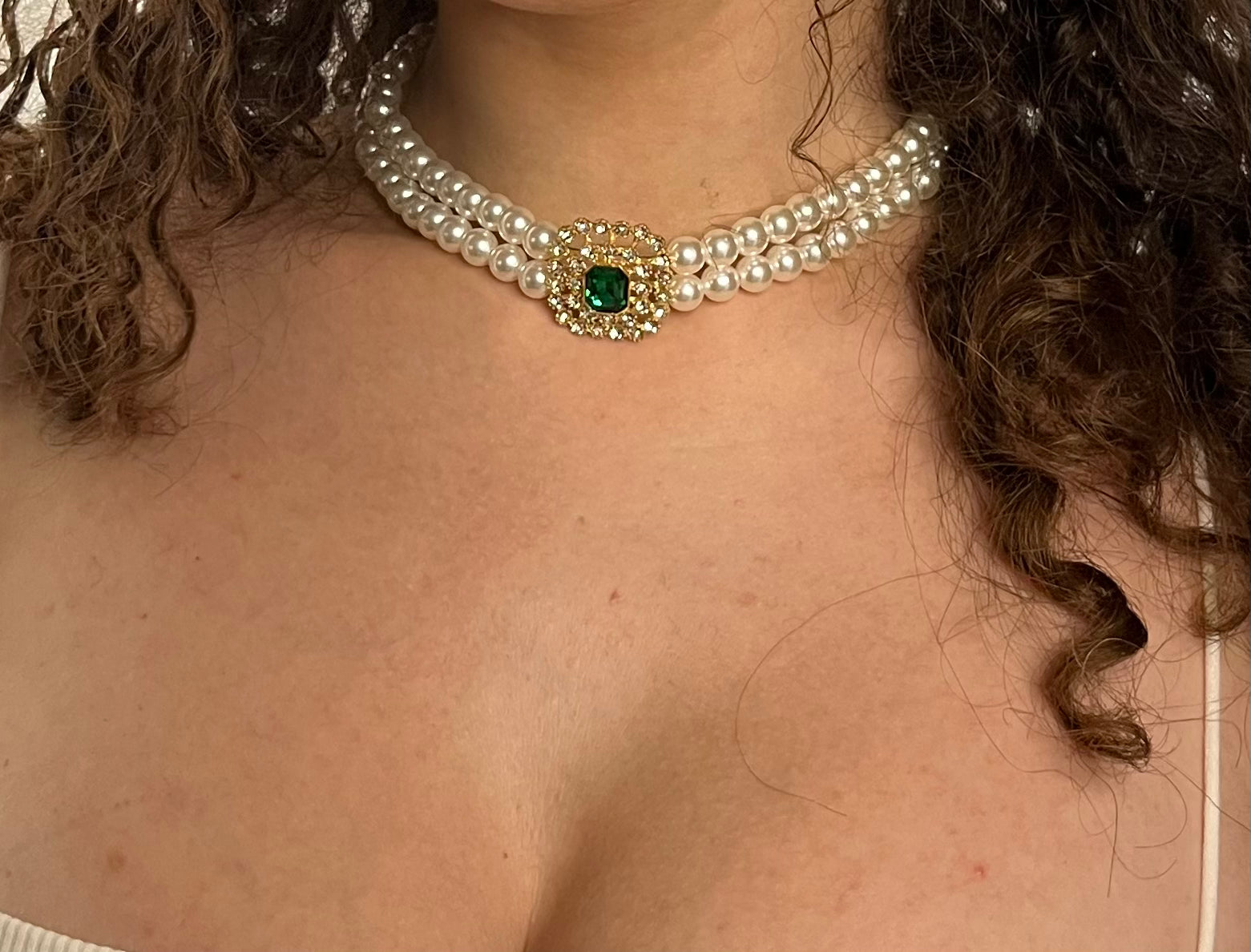 Collana in perle bianche con parte centrale verde e brillantini