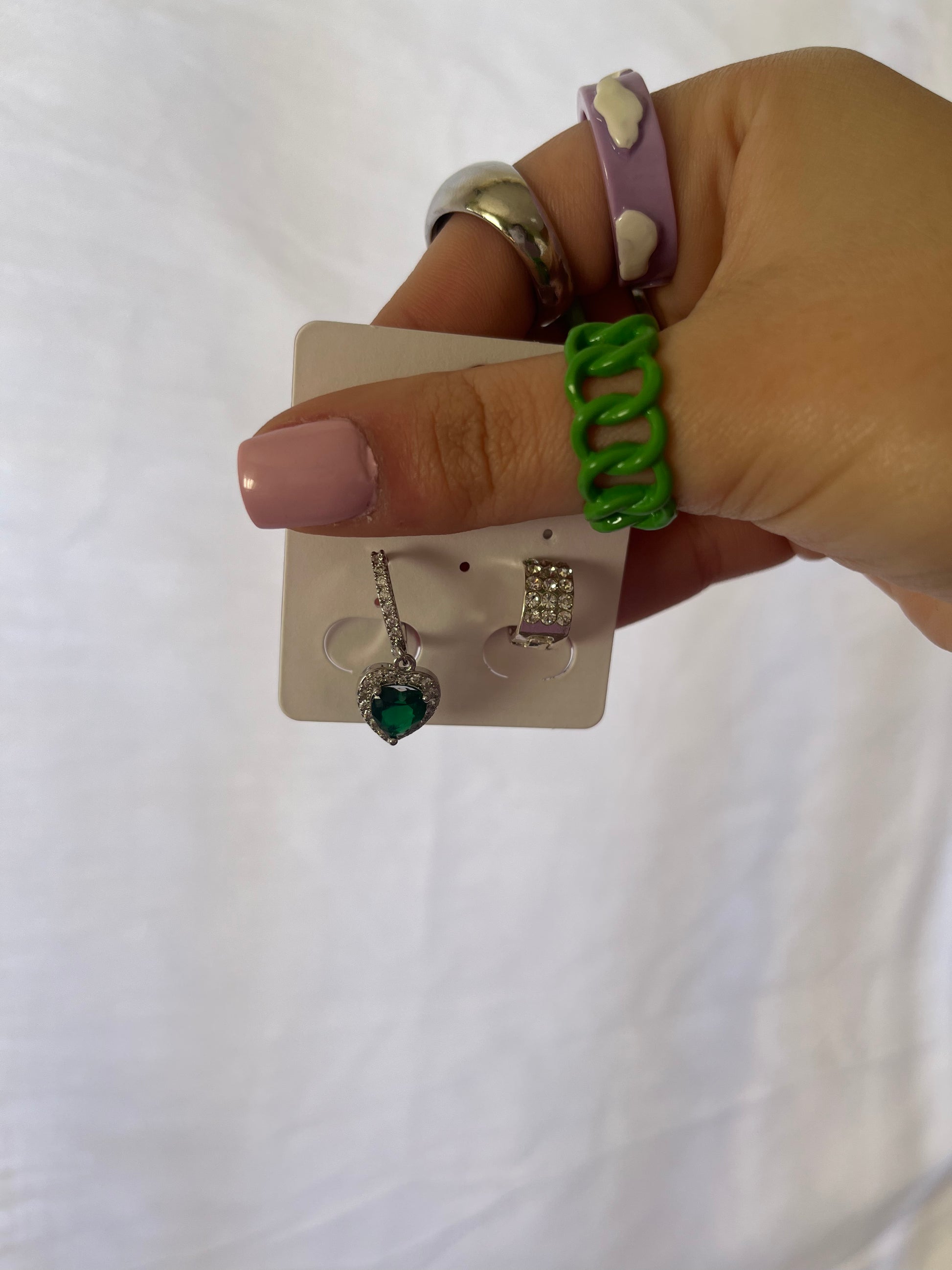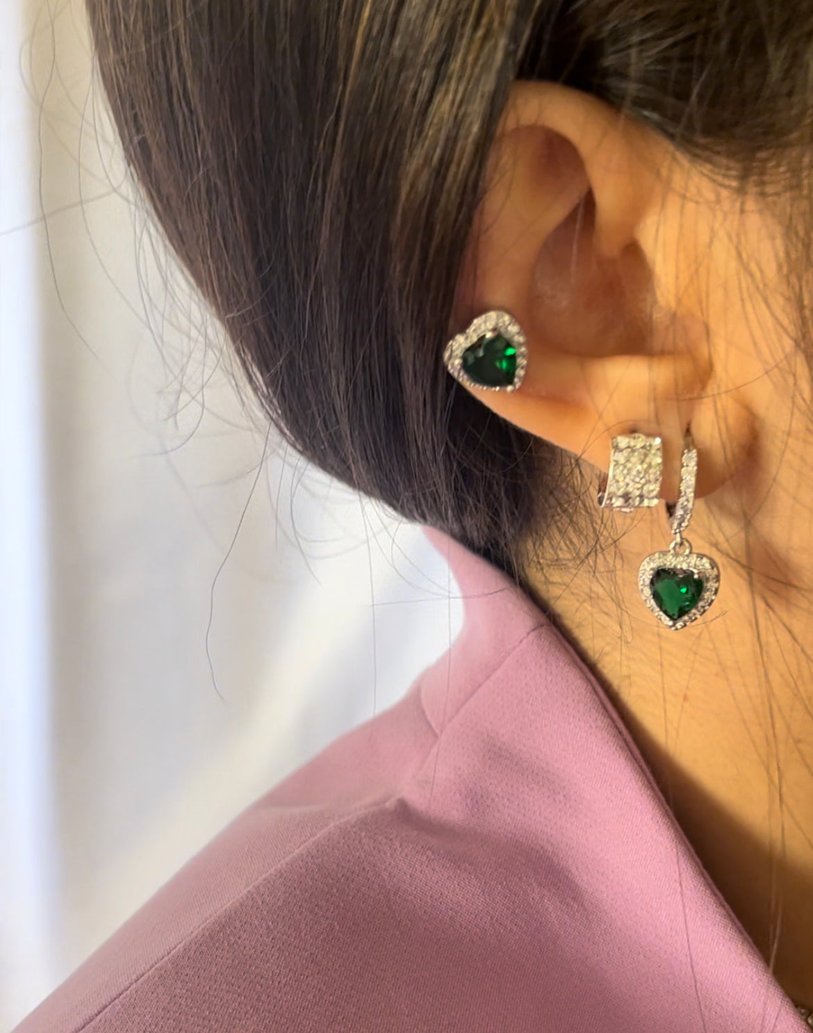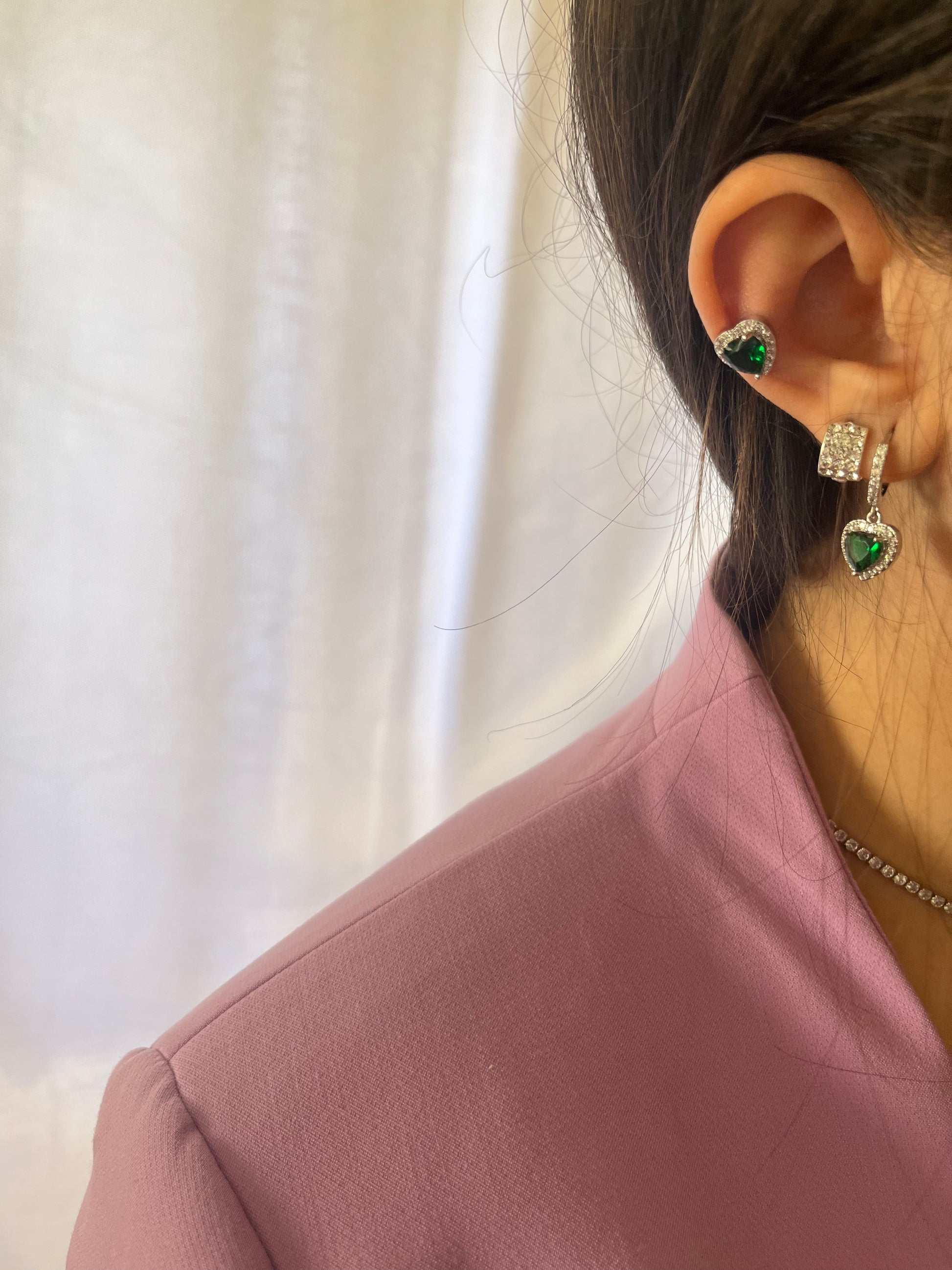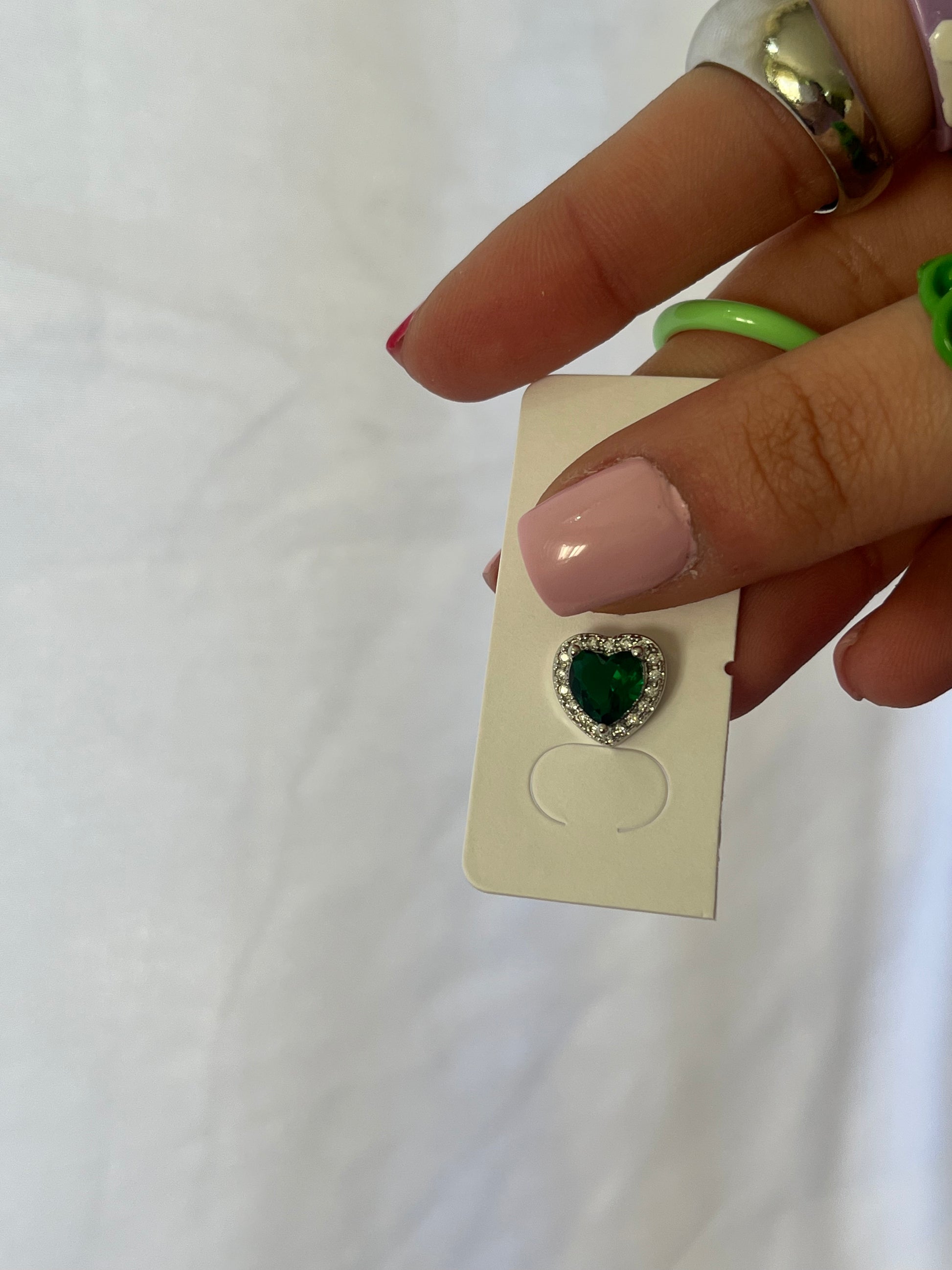 Un orecchino pendente con cuoricino verde