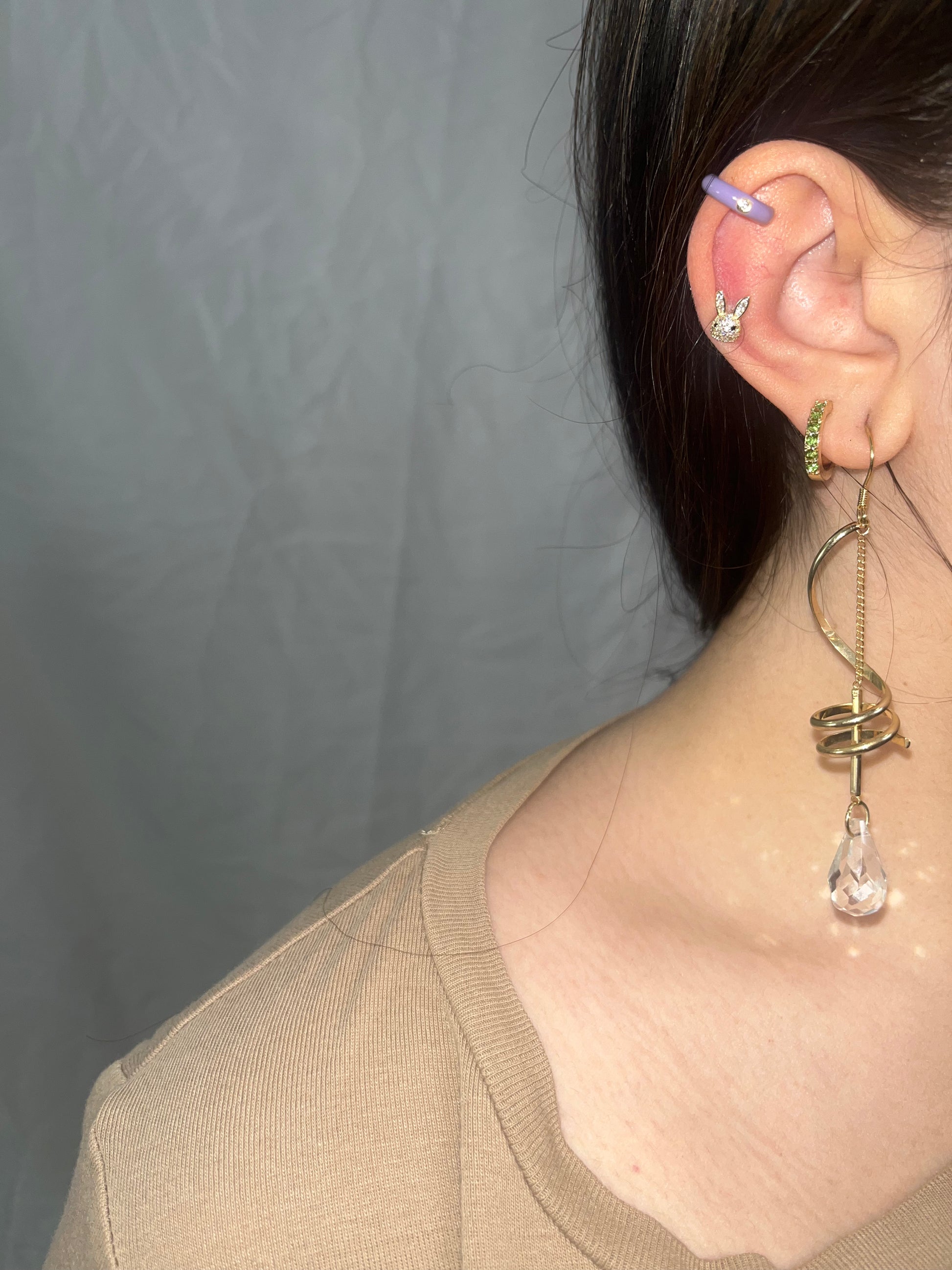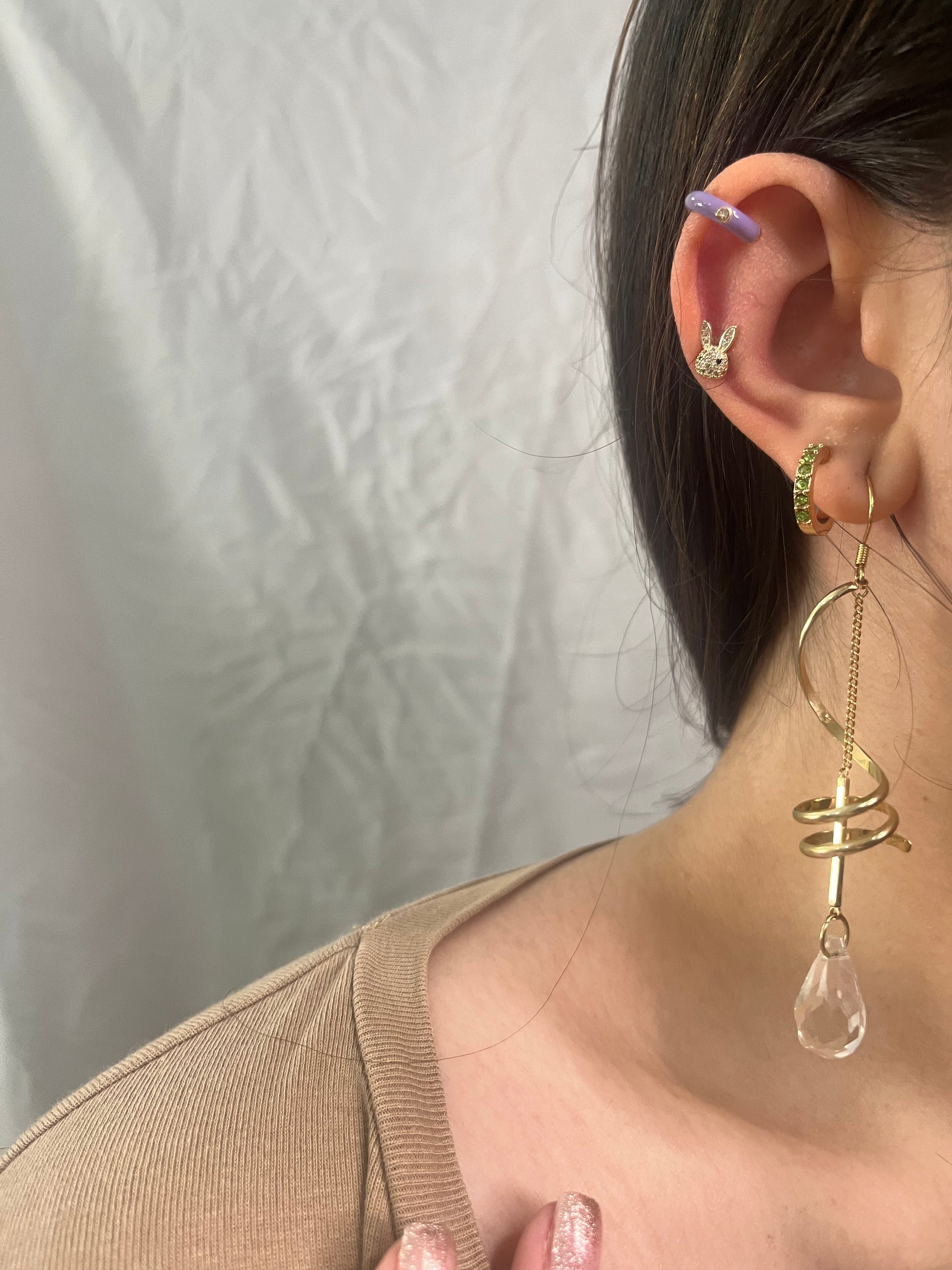 in foto sono poi indossati un false earring lilla e un hoop con diamantini verdi. Disponibili in shop ma non inclusi in questo prodotto.