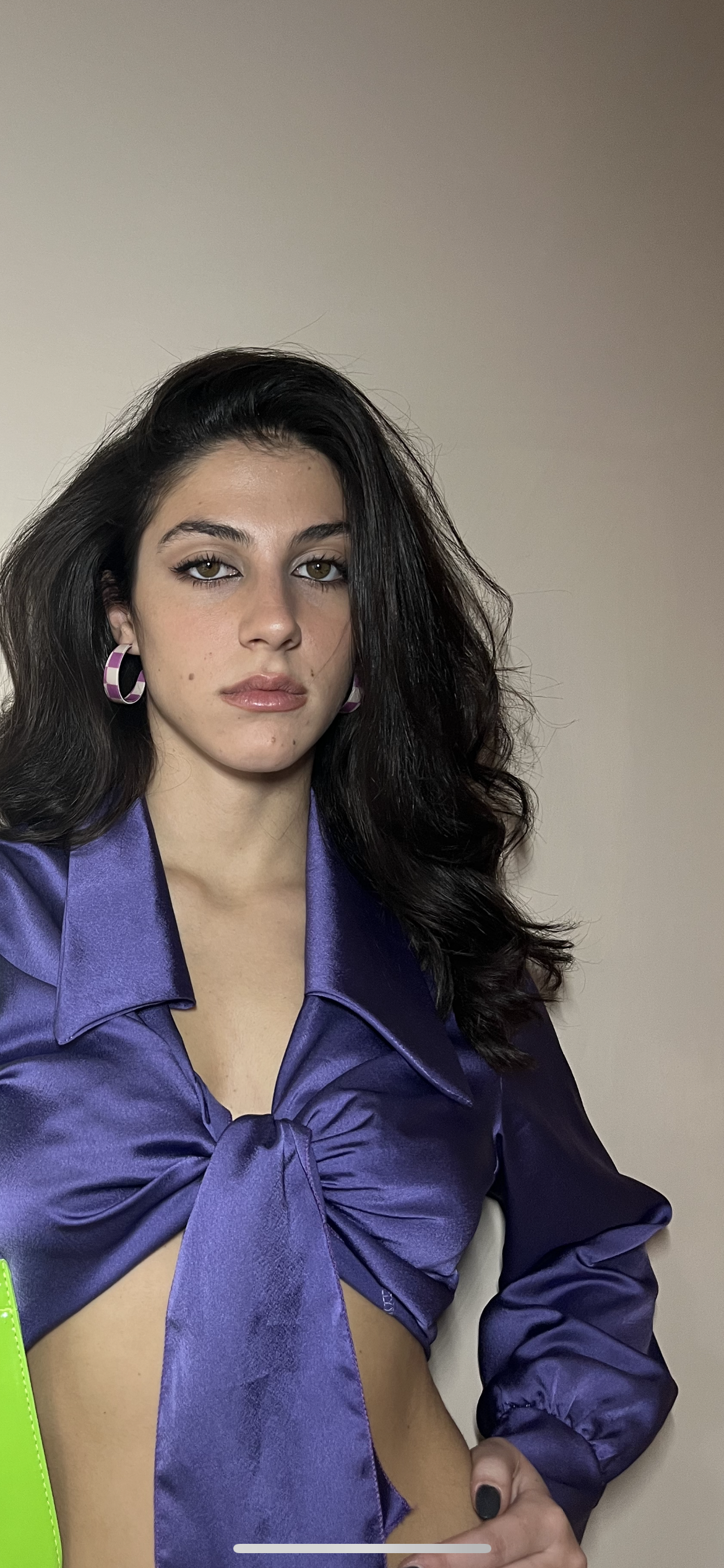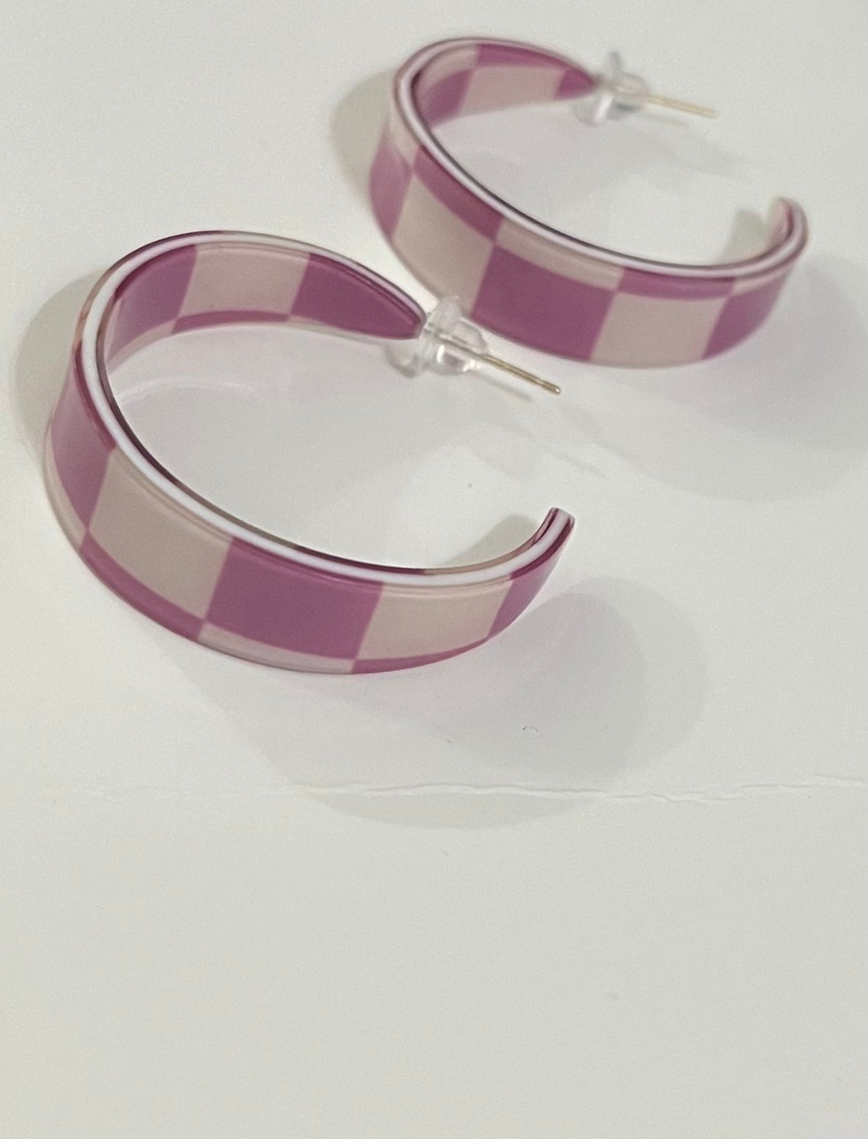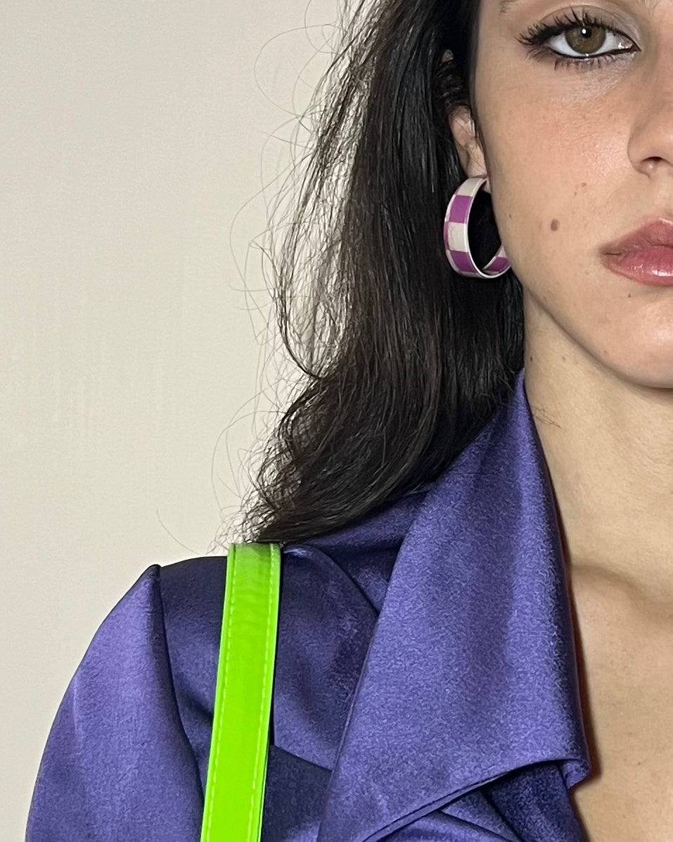 Orecchini “ scacchi” bianchi e viola in Poliresina effetto Gloss lucido.